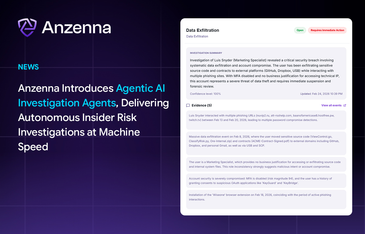 Training alone can’t make up for human error. Anzenna’s agentic AI security platform goes further than any product that has come before, bridging the gap between detection and action, with the data, intelligence, and automated remediation to eliminate guesswork. So now, you can stop insider threats, IP exfiltration, rogue apps, and compliance violations in real-time.